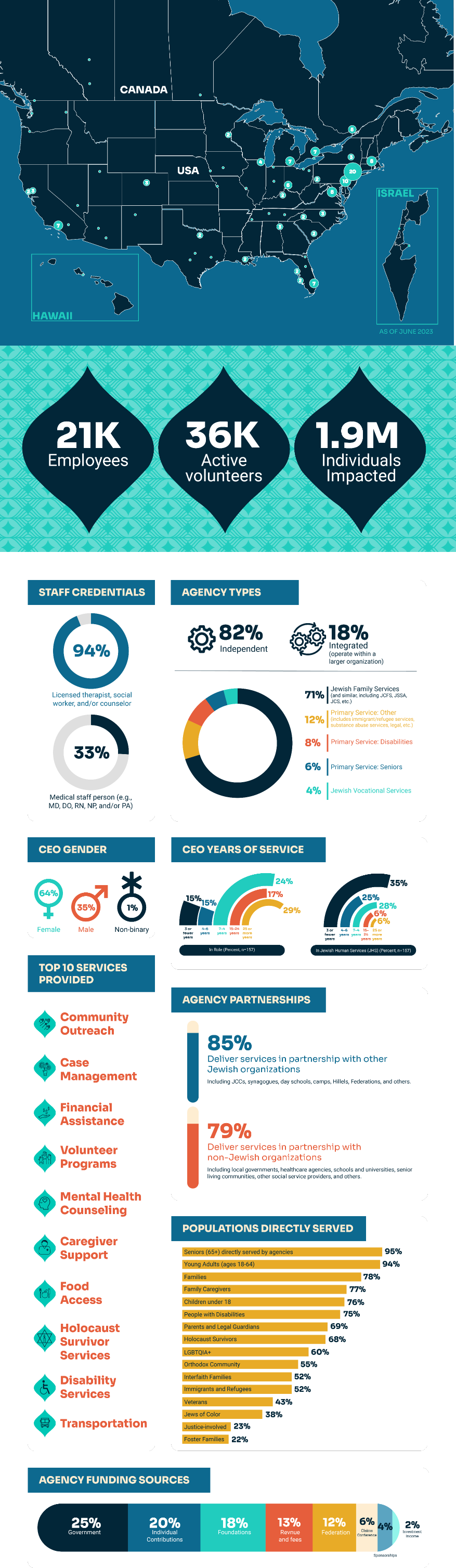 Findings from The Portrait of The Network, commissioned by The Network of Jewish Human Service Agencies (The Network) and conducted by Rosov Consulting, provides an in-depth understanding of its members, their agency profiles, services, strengths and challenges. The data below highlights the value and importance of the Jewish human service sector.